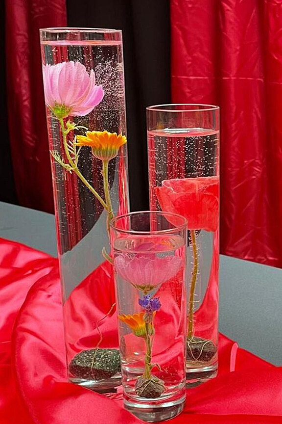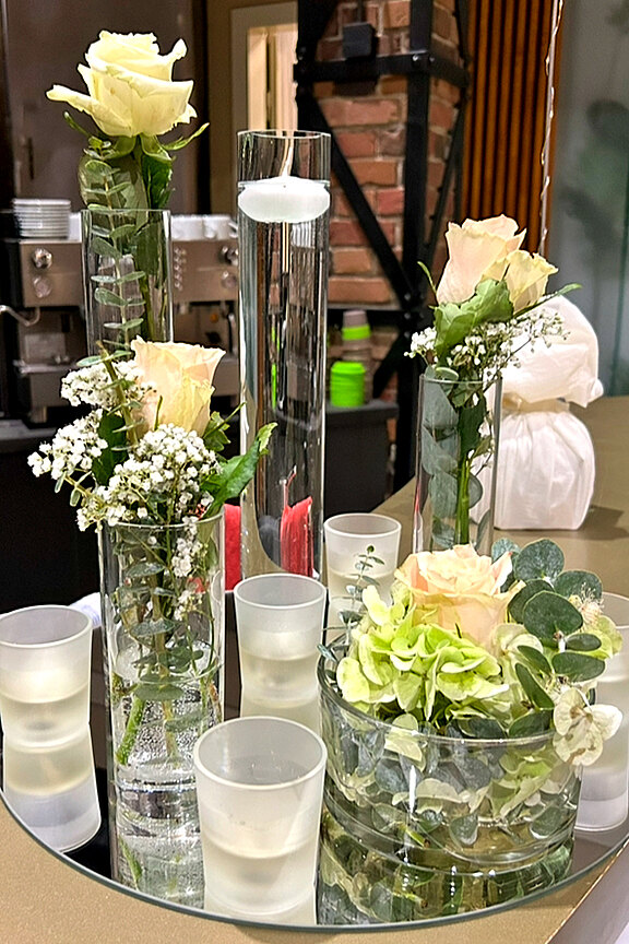 Wir bieten Ihnen eine Vielzahl an Glasvasen und Tischspiegel (rund bzw. rechteckig) sowie dazu passende Tischnummern